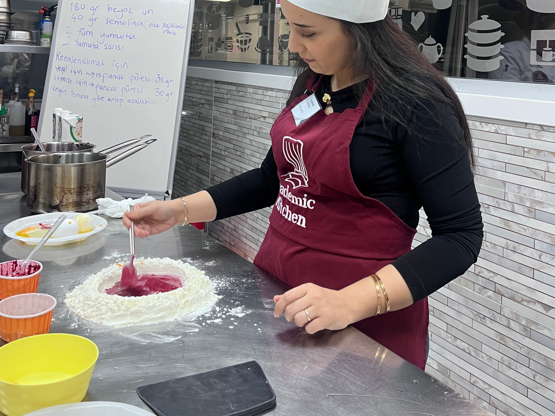 Şef Sena ile birlikte ıspanak ve pancar püreleri kullanarak yeşil ve kırmızı makarna hamurları hazırladık.