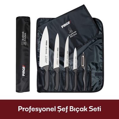 Profesyonel Şef Bıçak Seti (Pirge Marka): Eğitimlerimizde kullanılan Pirge marka 5’li şef bıçak seti ile kesim tekniklerini en doğru şekilde öğrenirsiniz. Dayanıklı çelik yapısı sayesinde uzun yıllar kullanıma uygundur ve şef adaylarının en çok ihtiyaç duyduğu tüm temel bıçak türlerini içerir.